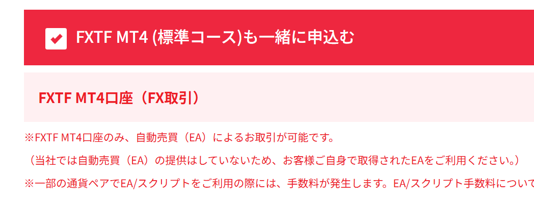 この際、MT4口座を申し込んでください。この口座のみ、EAが使えます。