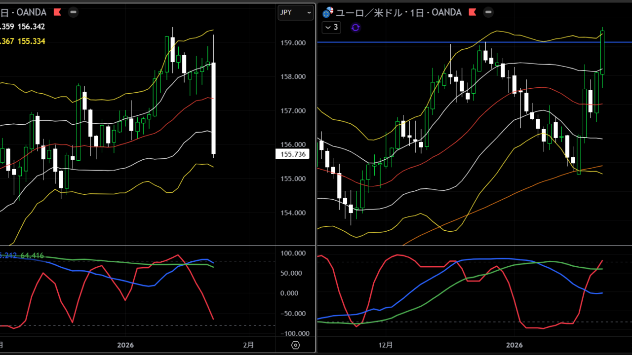 グリーンランド問題を巡り、英独仏などに対し2月1日から10%の追加関税を課すと表明。週明けのドル高要因となりましたが、週末のダボス演説がやや抑制的だったことで警戒感は一服しています。