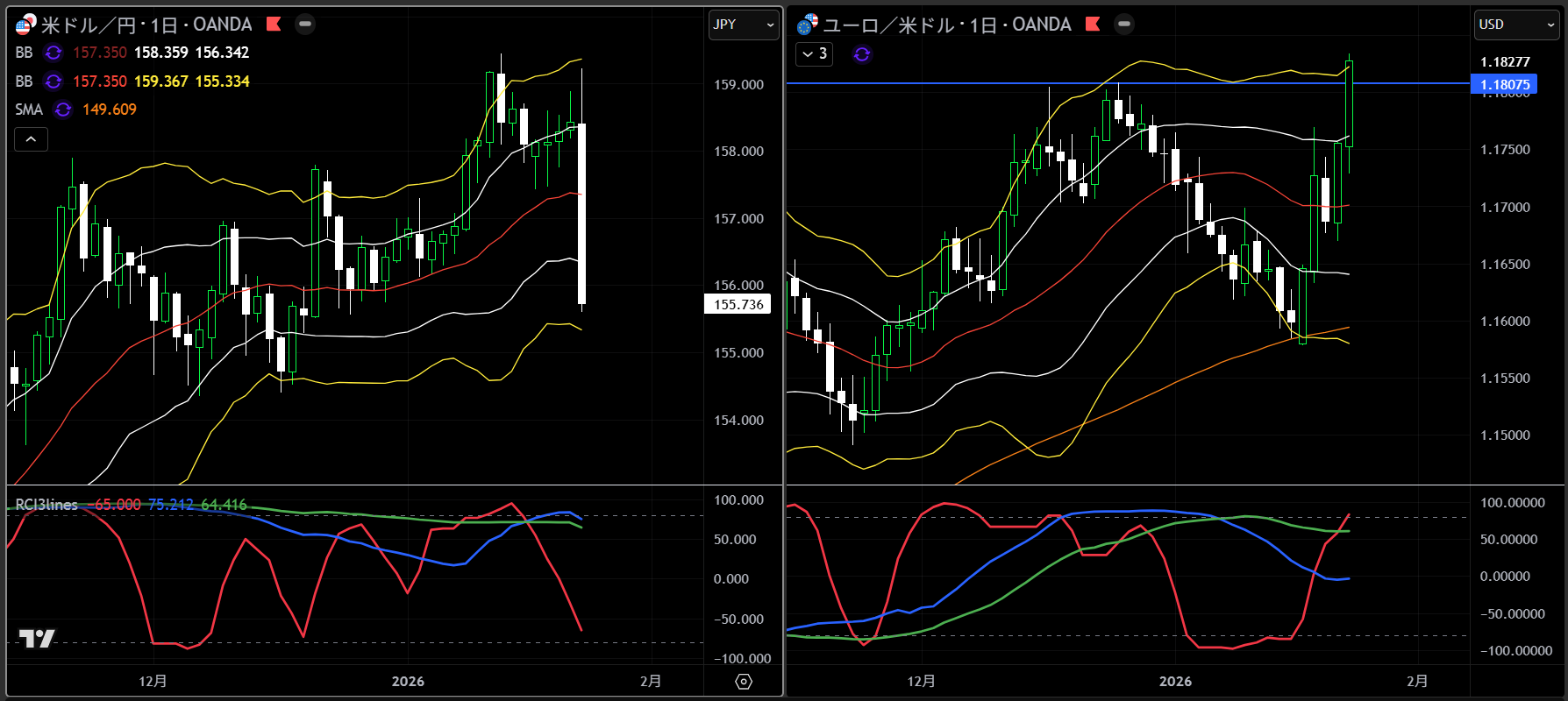 ※日足チャートにボリンジャーバンド(21)の±2σと200SMA、RCI(9,36,52)を表示