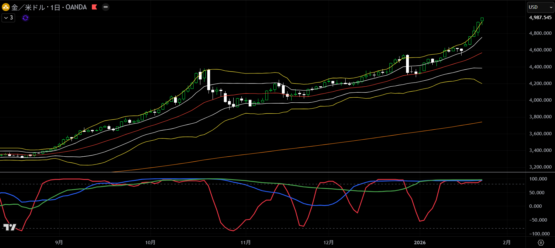 分かりやすい上昇バンドウォークなんですが、終値が+2σを突き抜けていて、相当強い動き。押し目を拾いたいっすね。