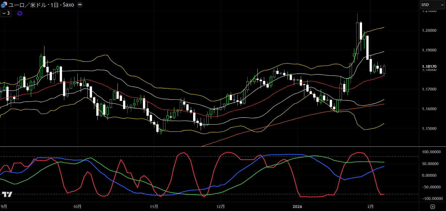 3本続けて下げたあと、ミドルライン付近で下げ止まり。