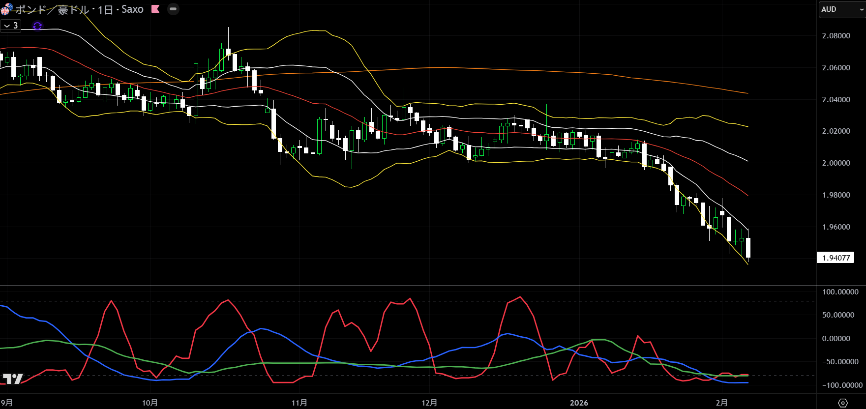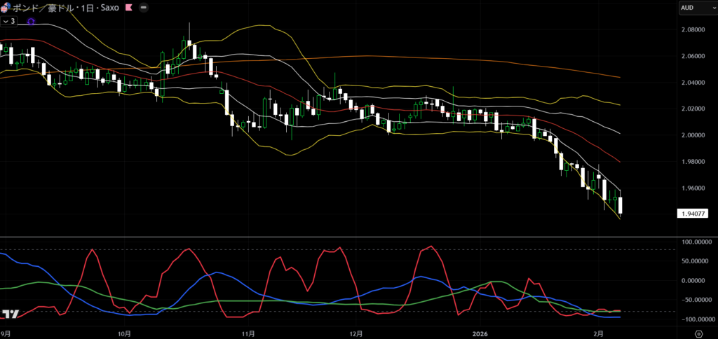 金曜時点では、GBPAUDの日足が綺麗な下降バンドウォークだったので、こいつで何度か売買して勝てました。