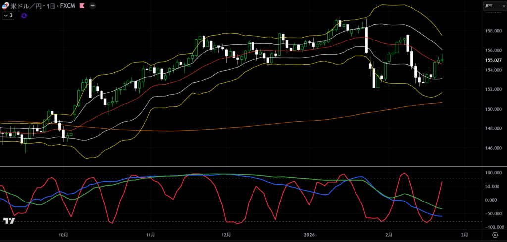 一時は155.60円台を試すも、米GDP悪化と最高裁判決で154.70円台まで急落。引けにかけてはトランプ氏の「関税逆襲宣言」によるドル買い戻しが入り、155円台を維持しました。
