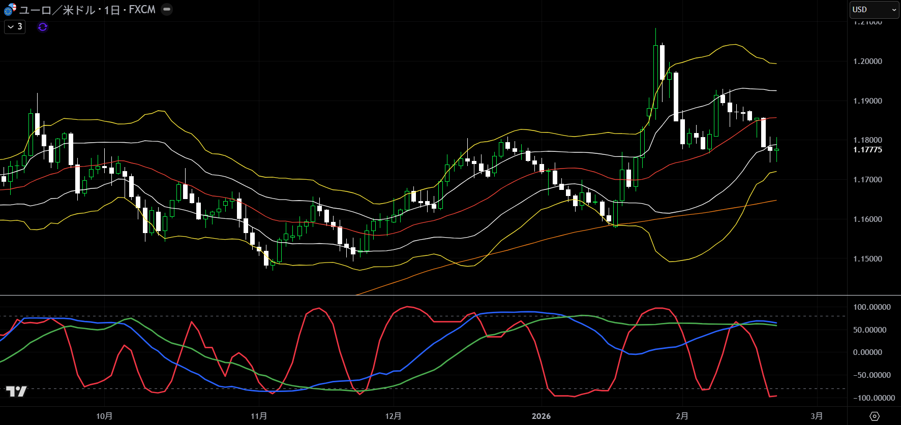 20日の10年債利回りは2.11%付近まで低下。インフレ率の急減速を受け、市場では日銀の追加利上げに対するハードルが高まったとの見方が支配的です。高市政権の財政拡大方針もあり、金融緩和的な環境が長期化する可能性が意識されています。