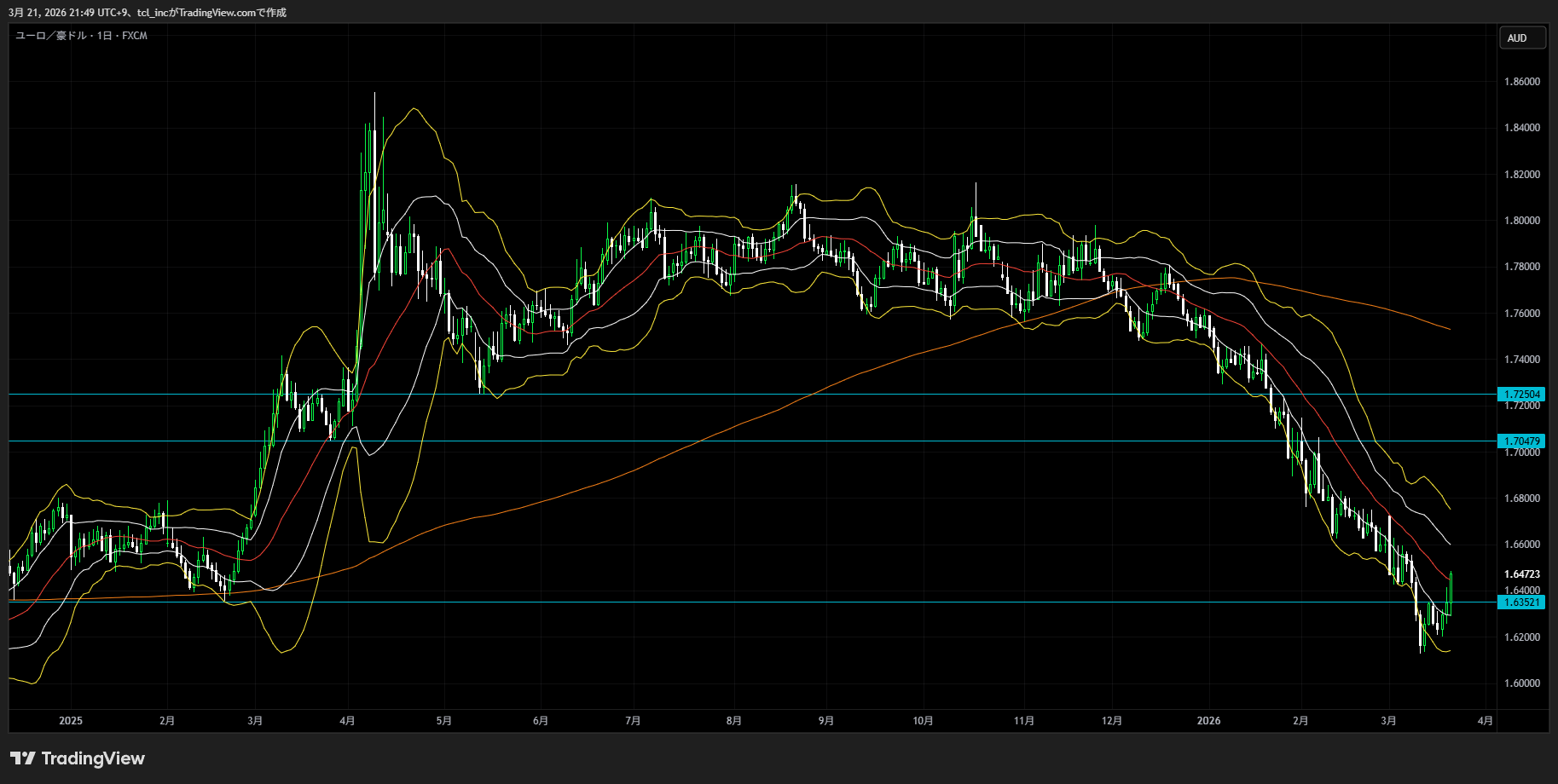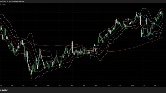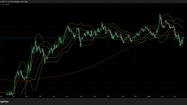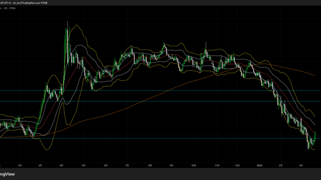 日足ボリンジャーバンドのバンドウォークが始まったと思いきや、わりとすぐに終わって締まった印象。直近の効いている水平線で止まっている状態で、これもよく分かりません。