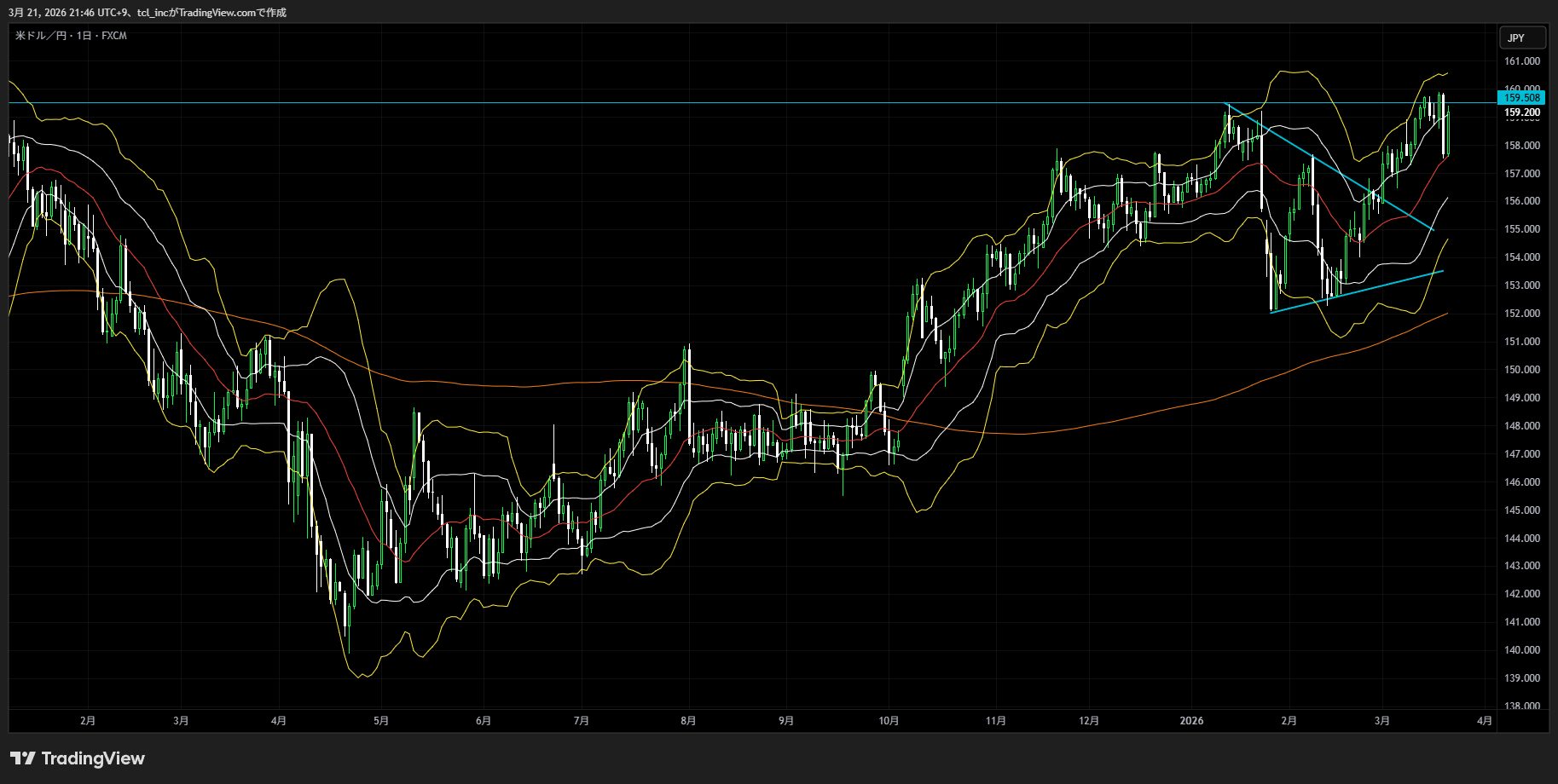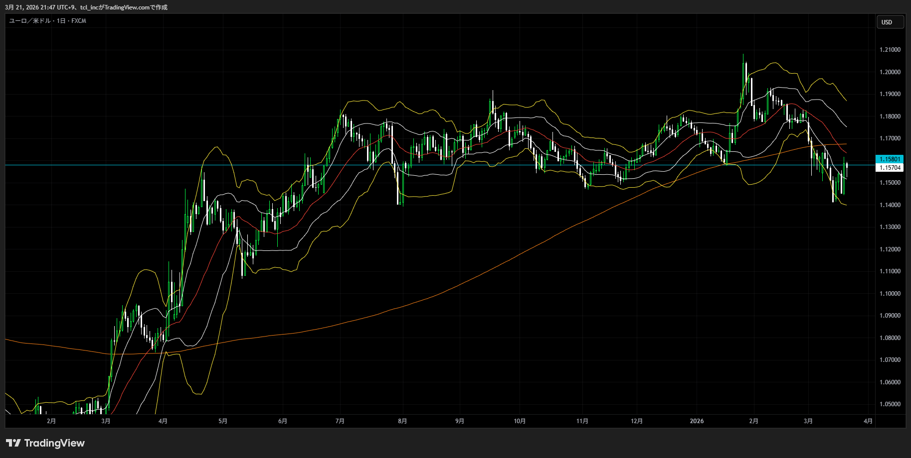 ※日足チャートにボリンジャーバンド(21)の±2σと200SMA、RCI(9,36,52)を表示